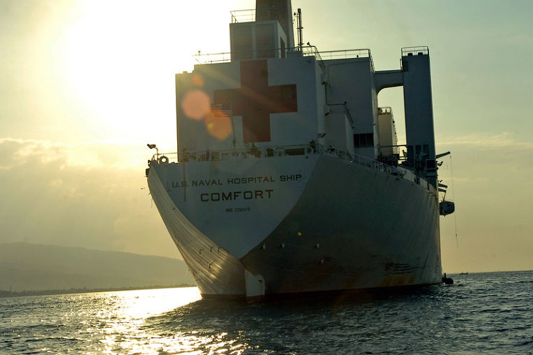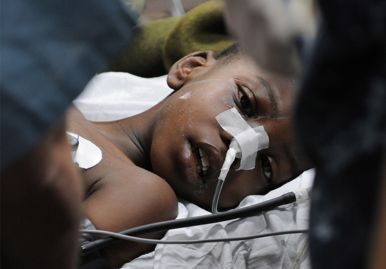 USNS 컴포트 선이 도착해서 헬리콥터로 이송 되어 치료 받는 고관절 골절된 아이.