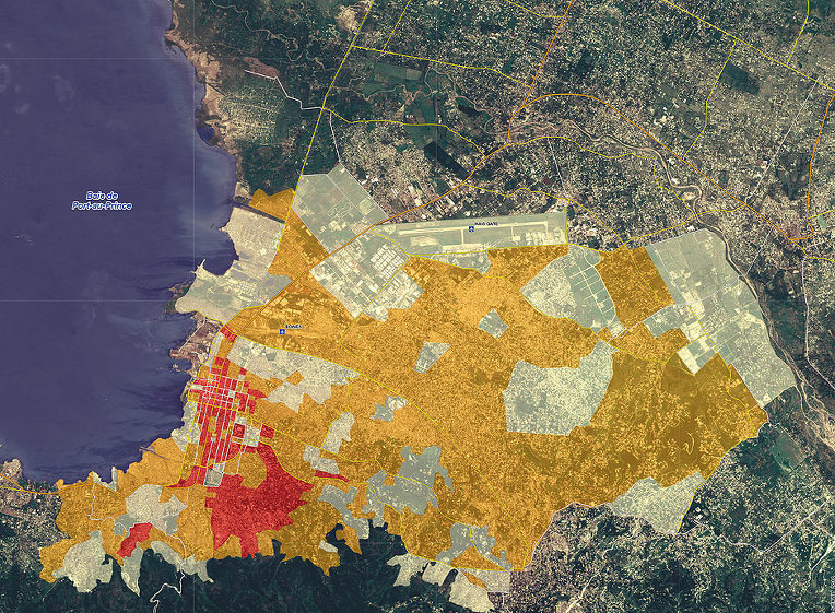 아이티 지진 규모를 위성 지도에 나타낸 모습, 빨간점은 진앙이며 빨간점
